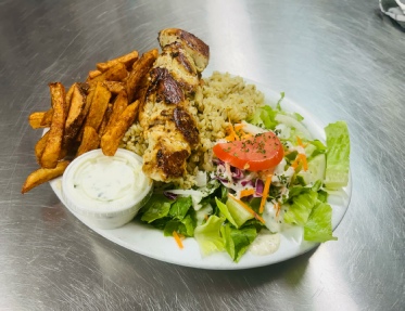 SERVIES AVEC SAUCE TZATZIKI, RIZ, FRITES ET SALADES DU CHEF |